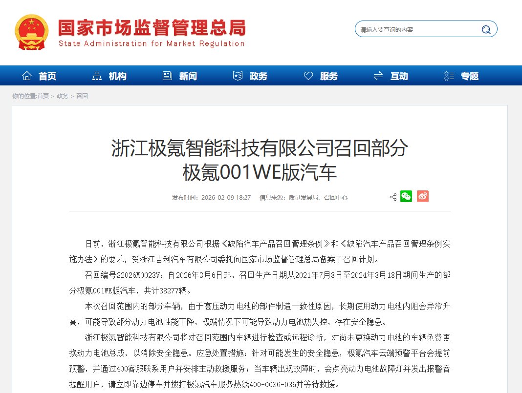 召回编号S2026M0023V:自2026年3月6日起,召回生产日期从2021年7月8日至2024年3月18日期间生产的部分极氪001WE版汽车,共计38277辆。