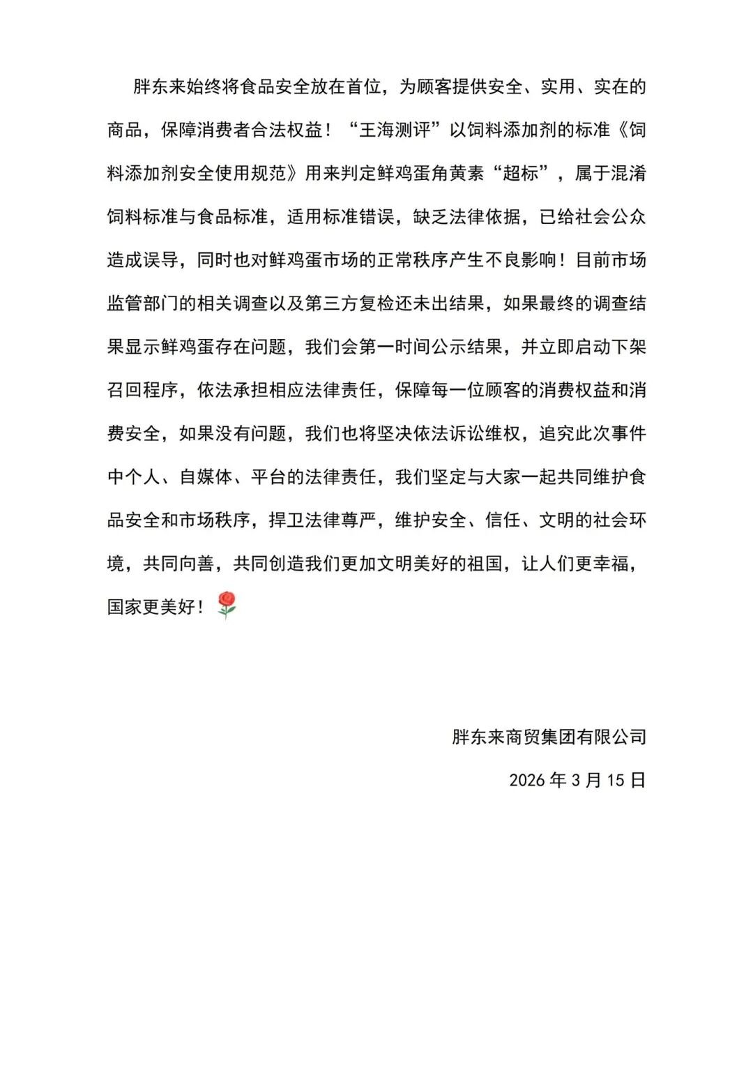 角黄素一事,称目前市场监管部门的相关调查以及第三方复检还未出结果,如果最终的调查结果显示鲜鸡蛋存在问题,会第一时间公示结果,并立即启动下架召回程序,依法承担相应法律责任。如果没有问题,胖东来也将坚决依法诉讼维权,追究此次事件中个人、自媒体、平台的法律责任。