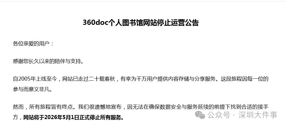 停止运营公告显示,因无法在确保数据安全与服务延续的前提下找到合适的接手方,网站将于2026年5月1日正式停止所有服务。即日起,360doc个人图书馆网站暂停新内容发布,但登录、数据备份、VIP退费申请热点关注、钱包提现功能均正常开放。