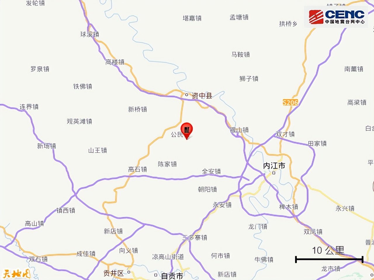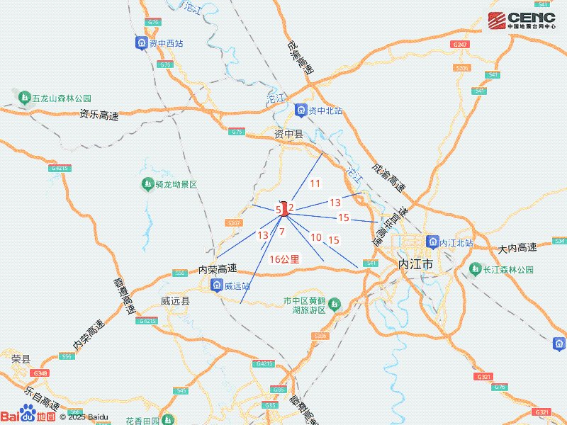周边县城:震中距资中县12公里、距东兴区23公里、距威远县23公里、距市中区23公里、距大安区34公里,距内江市22公里,距成都市133公里。