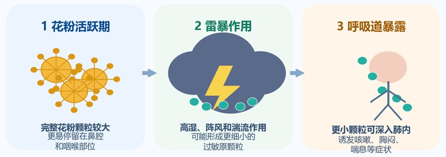 中国气象科学院研究员安兴琴介绍,雷暴哮喘并非偶然的“下雨天不舒服”,而是雷暴这类强对流天气过程改变了空气中花粉等过敏原颗粒的状态和分布,导致易感人群集中暴露,从而出现明显的呼吸道症状加重。