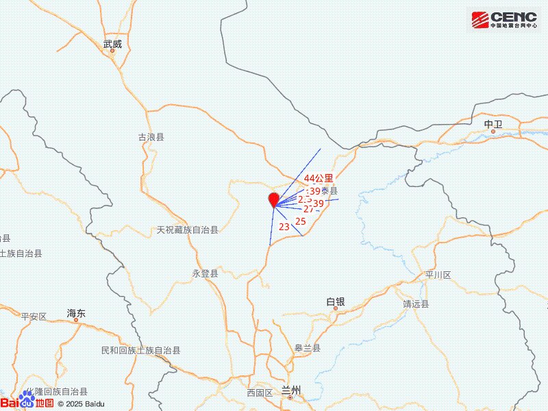 周边县城:震中距景泰县31公里、距天祝藏族自治县54公里、距永登县59公里、距白银区74公里、距古浪县84公里,距白银市73公里,距兰州市117公里。
